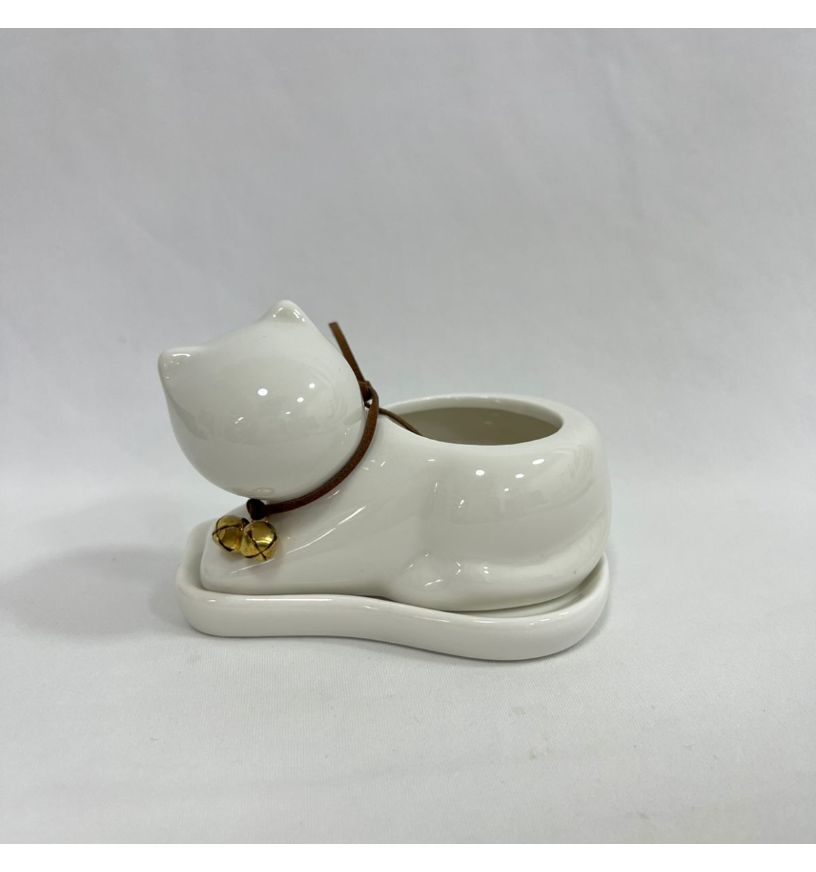 Cachepot Gato Deitado Branco com sino ,Linda peça decorativa, para deixar seu Jardim encantado.