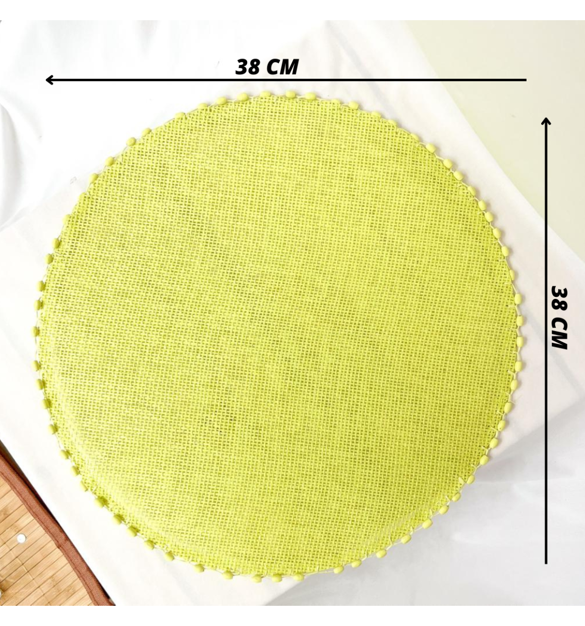 Jogo Americano Verde Limão Candy redondo trançado com bordas enfeitadas com bolinhas de madeira na cor Azul.