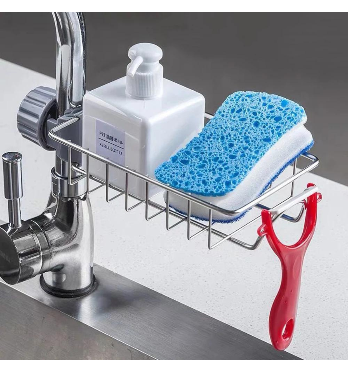 Com sua estrutura de aço inoxidável grande e plana, o Organizador Multiuso suporta perfeitamente varios acessórios de cozinha e banheiro, como buchas ou esponjas de limpeza.