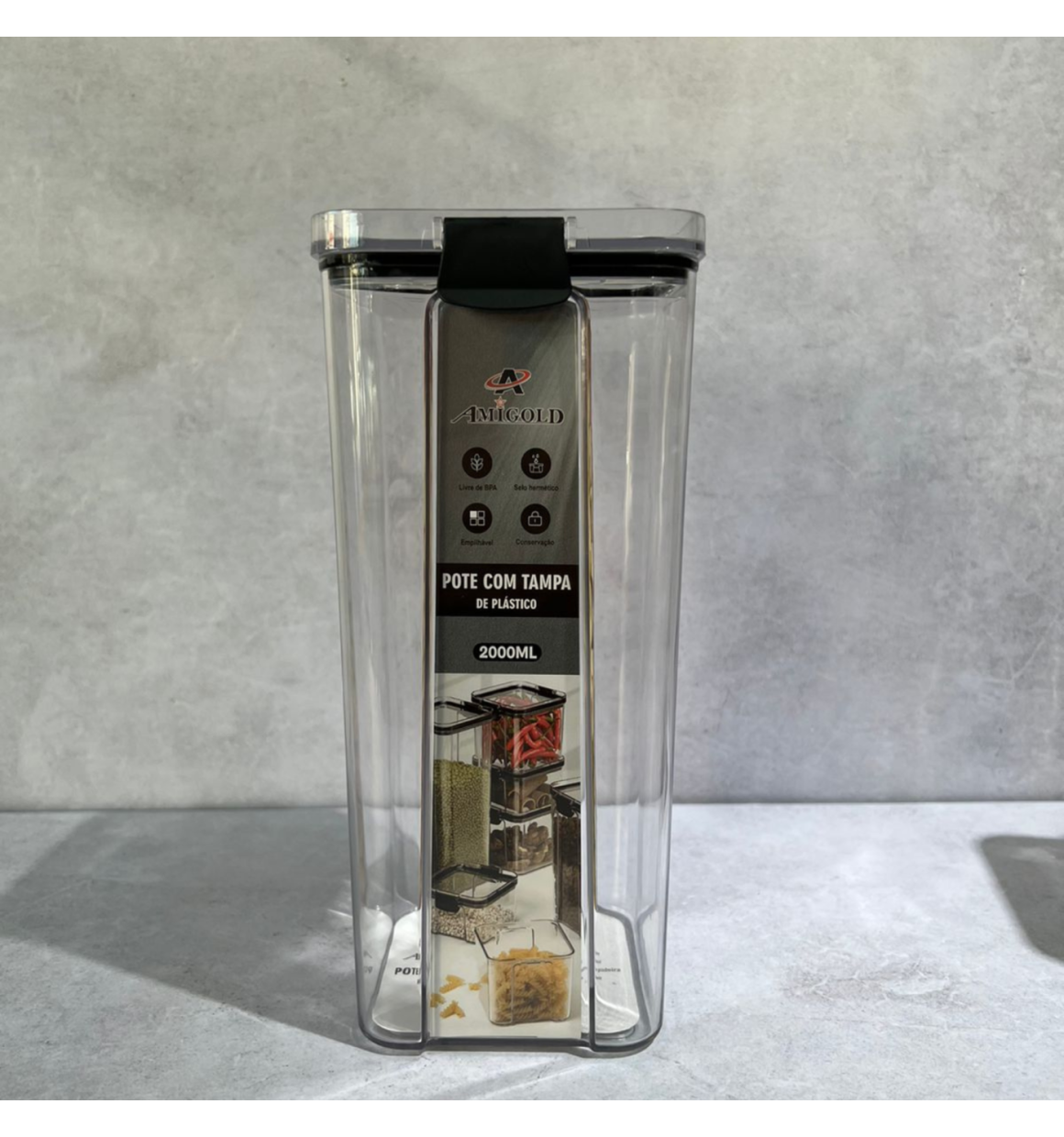Pote Hermético Quadrado Transparente Com Trava - Preta 2000ml