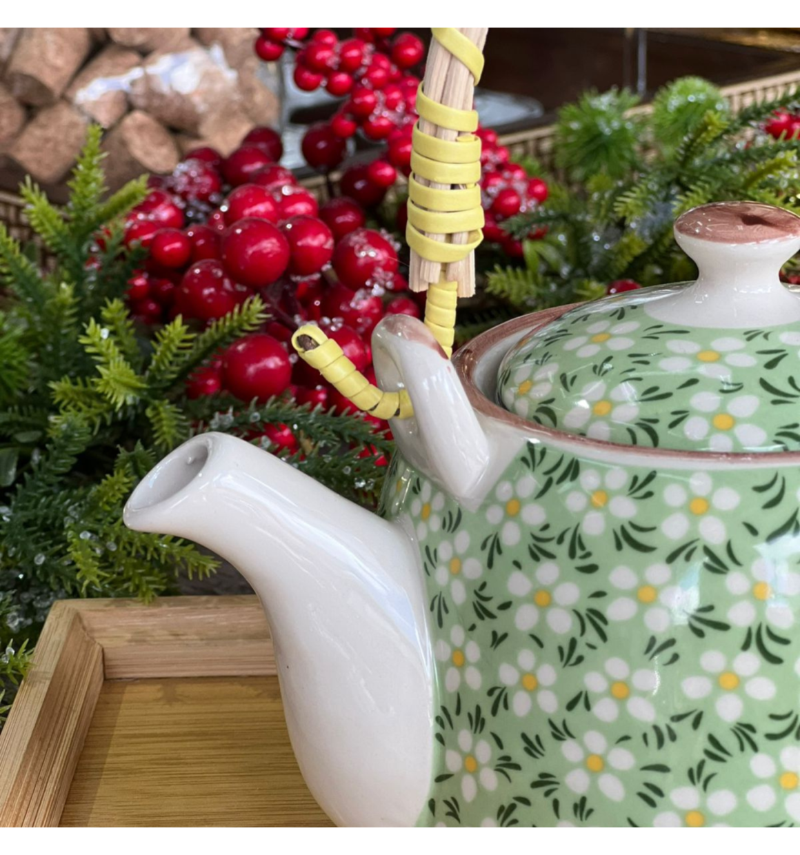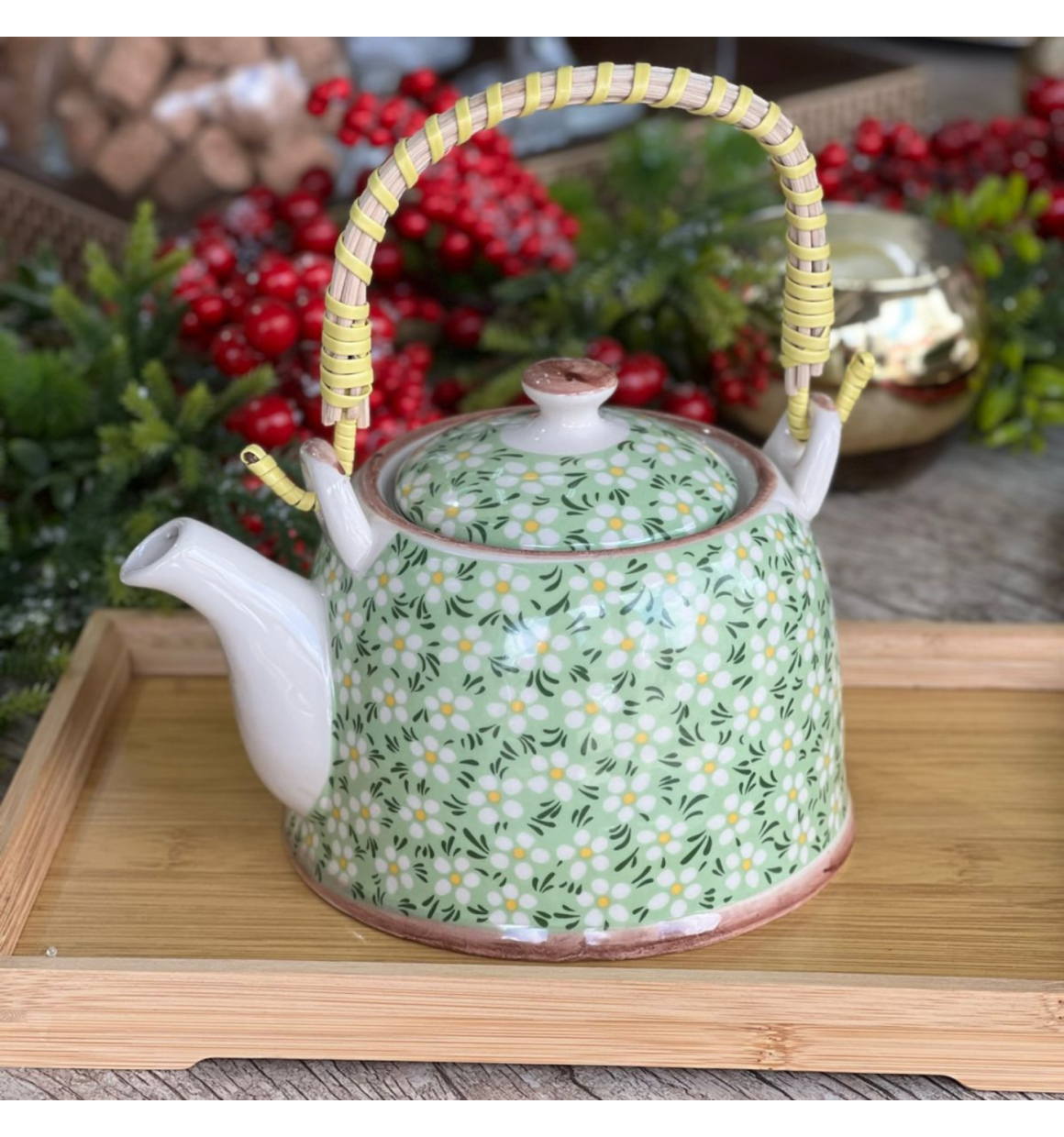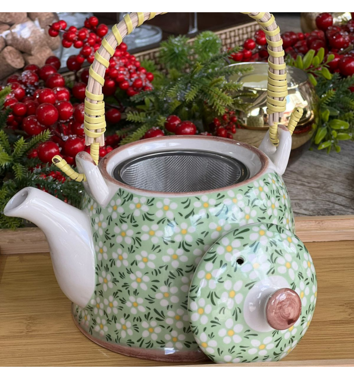 Bule de porcelana decorativa estilo oriental com decoração floral e alça de bambu trançado. acompanha tampa e infusor que se encaixa na borda, facilitando o preparo do chá. alça e coador removivel para lavagem.