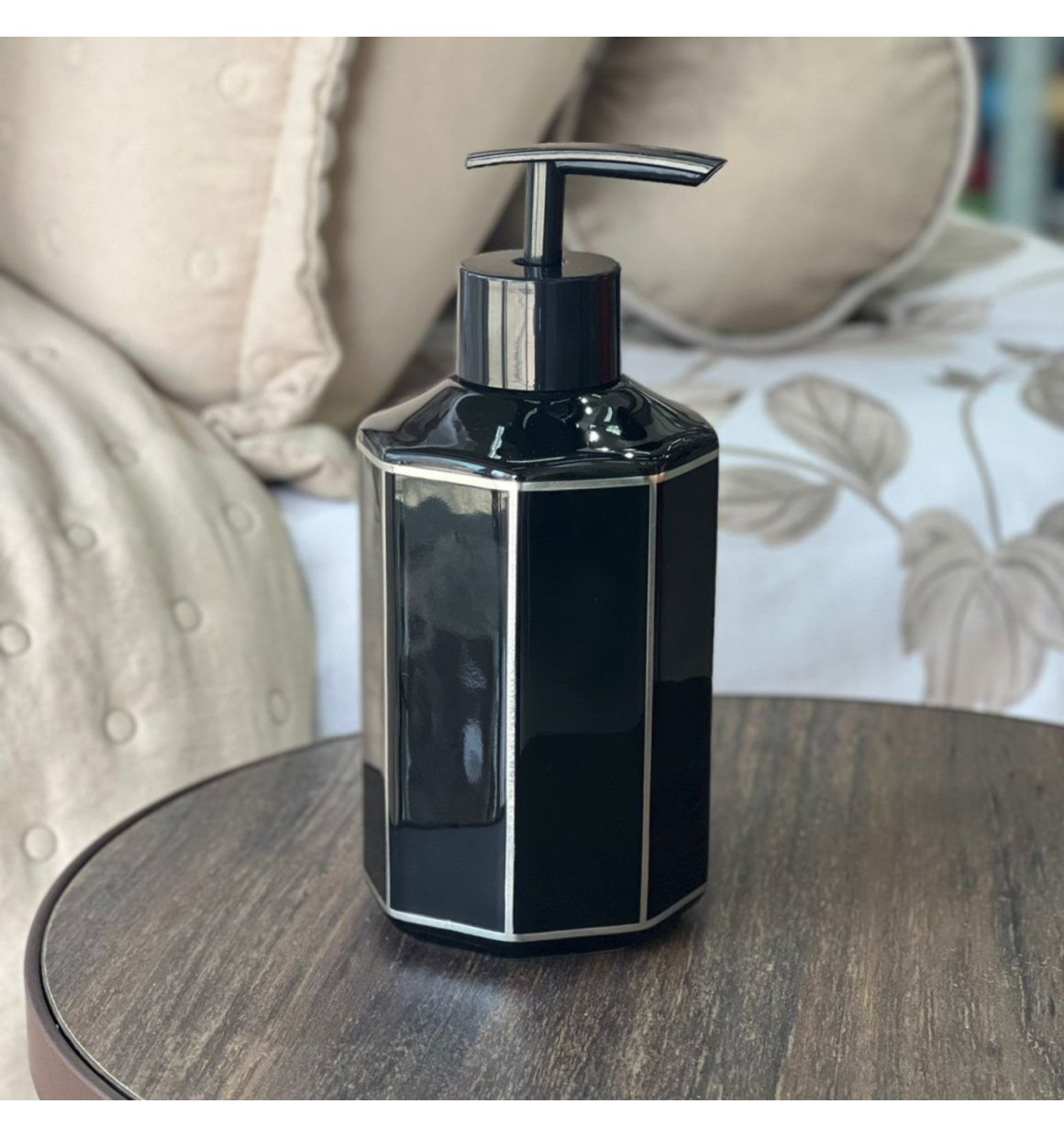 Porta Sabonete Liquido Preto C/ Borda Prata de Porcelana