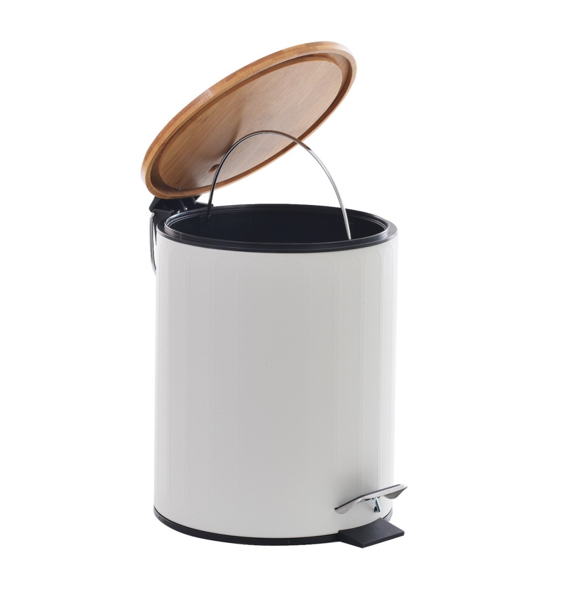 Lixeira 5L Branca com Tampa de Bambu com Pedal Canelada