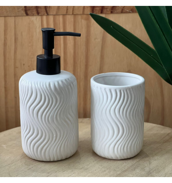 Medidas Precisas: O porta-sabonete líquido possui dimensões de 8cm de altura por 18cm de diâmetro, enquanto o objetos multiuso tem 11cm de altura por 8 cm de diâmetro,proporcionando espaço ideal para armazenar até 450ml de líquido..