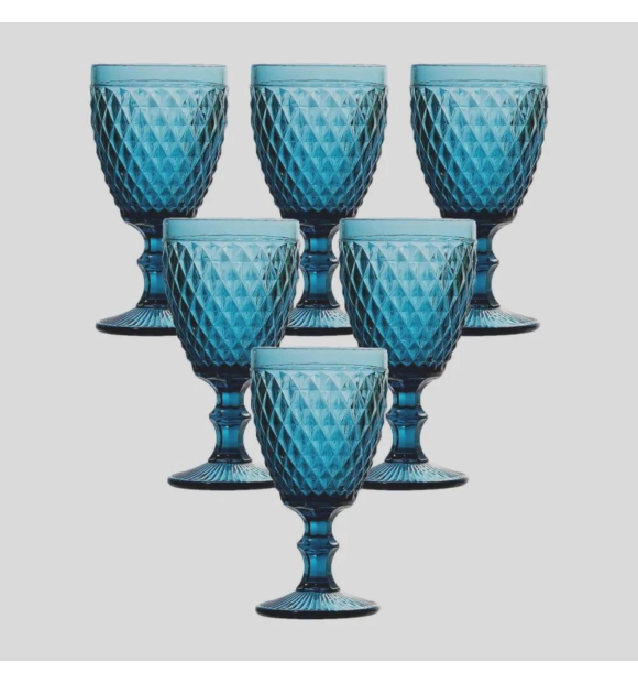 O Jogo de 6 taças de água Azul modelo Bico de Abacaxi feita em vidro de ótima resistência. Item versátil, de fácil limpeza e armazenamento. Taça transparente o Bico de Abacaxi 325ml apresenta design vistoso e moderno, tendo o corpo todo decorado com losangos em relevo, charmosos e brilhantes como pequenos triângulos. Na composição de sua mesa posta, as taças de vinho, agua ou suco ocupam um lugar de destaque na decoração, já que são belíssimas e fáceis de combinar com outros utensílios para servir.