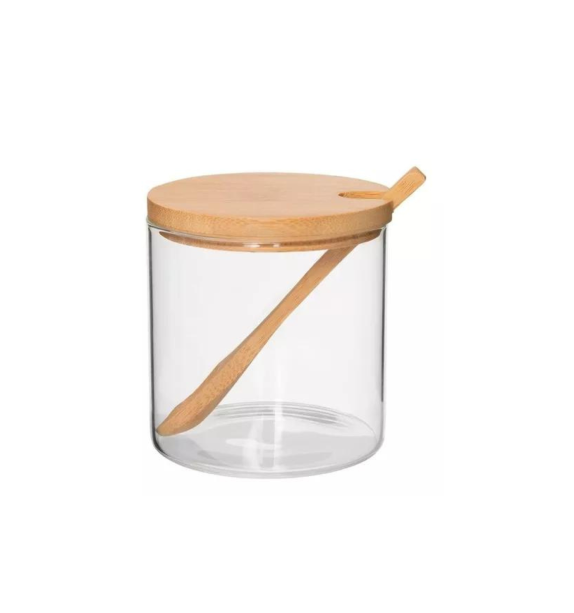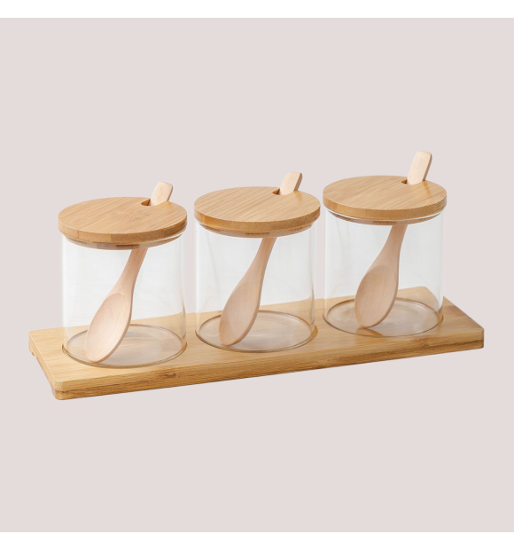 Kit 3 Potes de vidro com Colher e Bandeja de Bambu