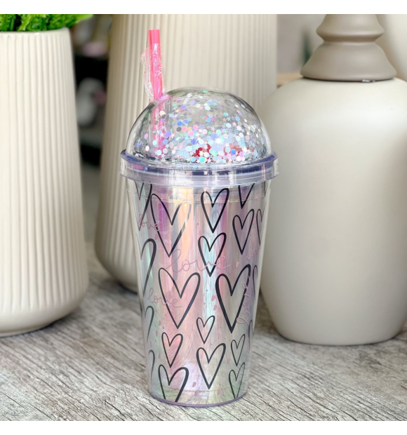 Copo Degradê de Plástico com Canudo Mod.2 - Corações 450ml