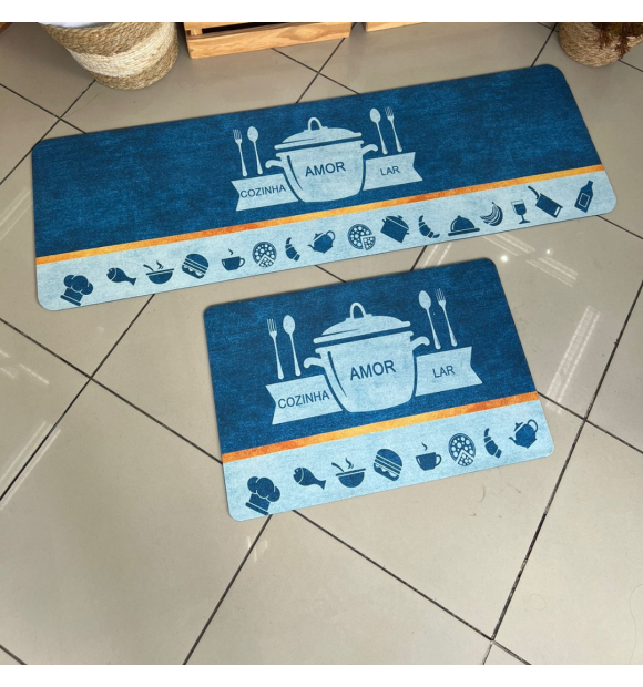 Kit Passadeira / Tapete de Cozinha 2 Peças "Panela e Garfos" Azul