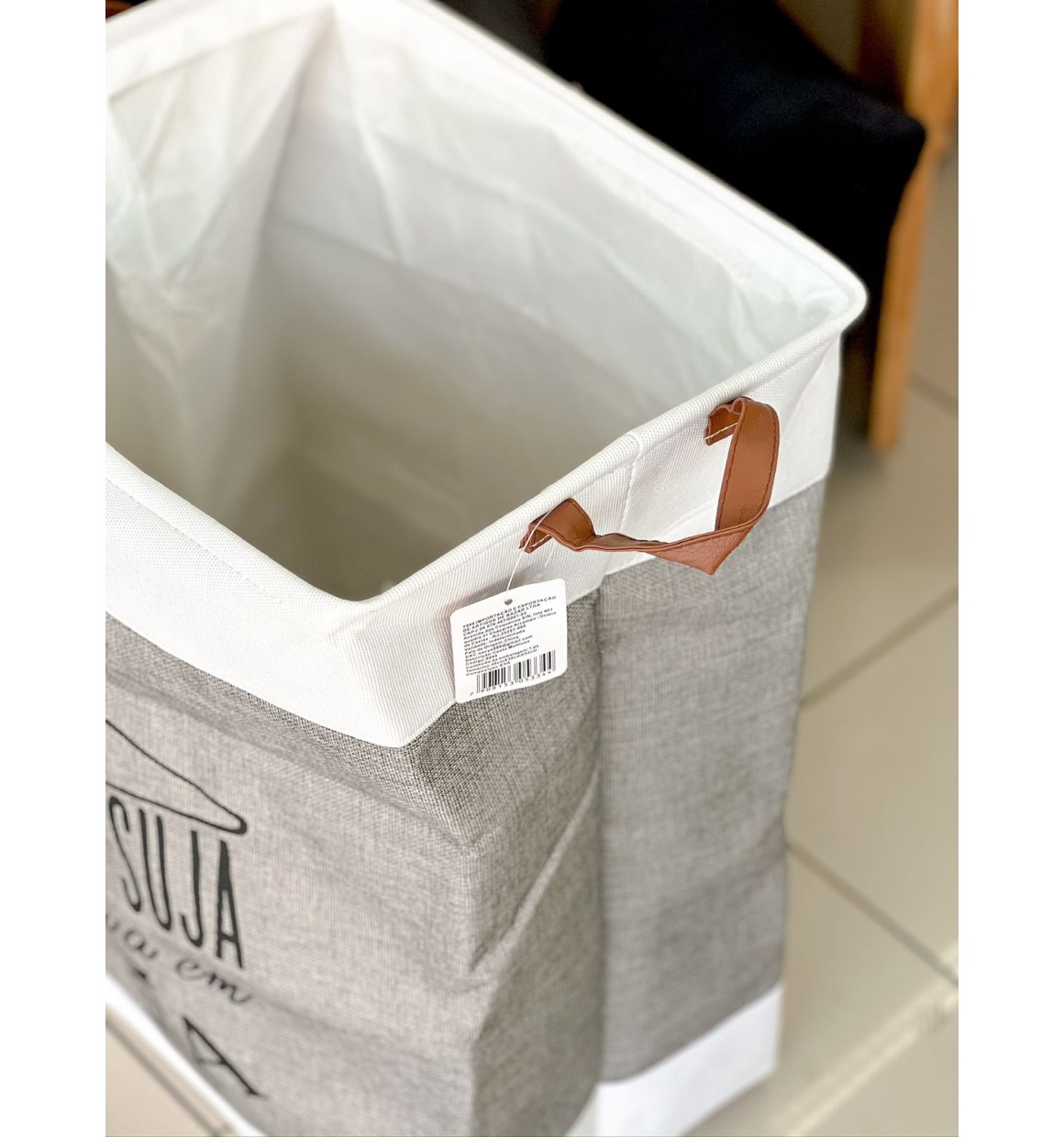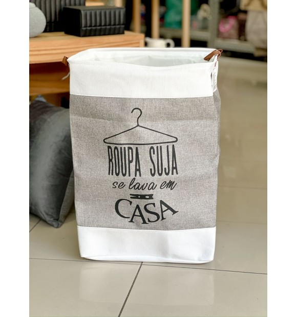 Cesto de Roupa Cinza c/ Branco "Roupa Suja se Lava em Casa" 40cm X 30cm X 55cm