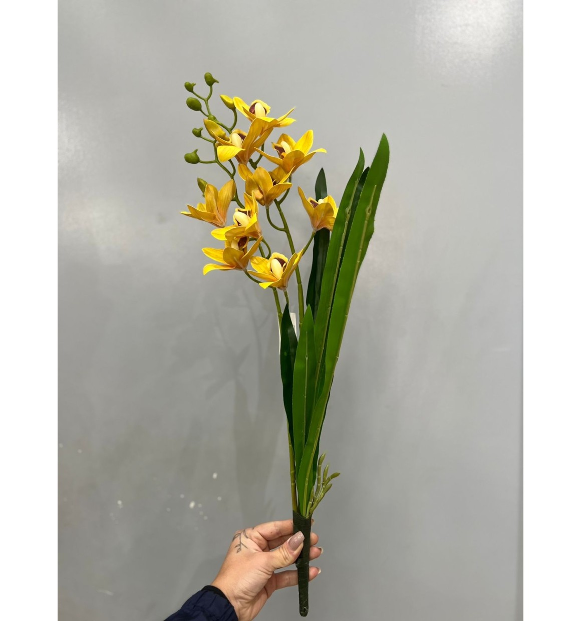 Para uma decoração cheia de vida e cor, aposte na orquídea amarela com folhagem artificial! Delicada, vibrante e super fácil de manter sem precisar se preocupar com cuidados!, ela traz toda a elegância das flores naturais para dentro de casa, sem complicações.