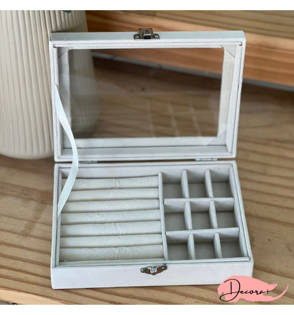Para suas joias mais preciosas, um porta-joias à altura! O acabamento em veludo branco e a tampa de vidro deste Porta Joias proporcionam uma combinação perfeita de elegância e praticidade, protegendo suas peças e as exibindo de forma encantadora.