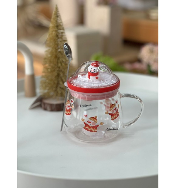 Caneca de Vidro com Colher e Tampa 400ml - Boneco de Neve