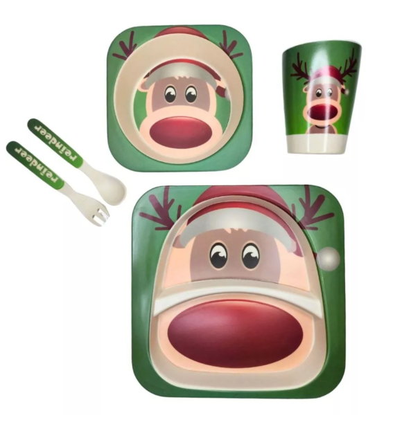 1 prato com divisórias 21cm, 1 tigela 14cm ,1 copo 9,5cm 1 garfo e 1 colher de 13cm .