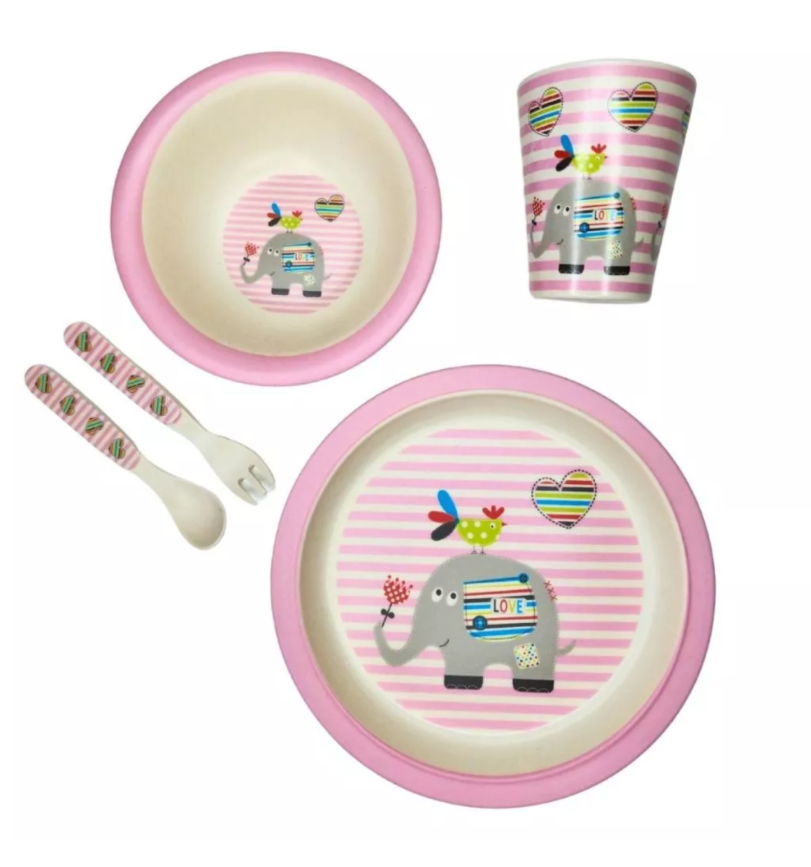 1 prato com divisórias 21cm, 1 tigela 14cm ,1 copo 9,5cm 1 garfo e 1 colher de 13cm .